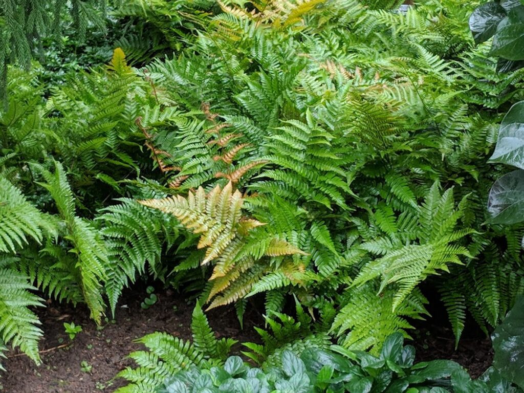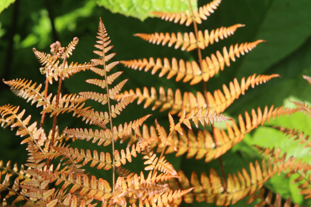 Autumn Brilliance Fern is a fern with orange emerging fronds contrasted with bright green mature fronds.