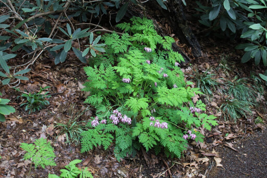 Native. A shade perennial with bluish-green fern-like foliage. Flowers are pink and heart-shaped with a drop-like petal on the bottom in the spring.