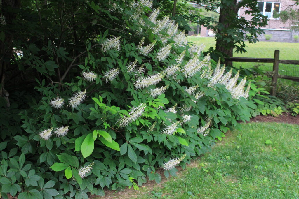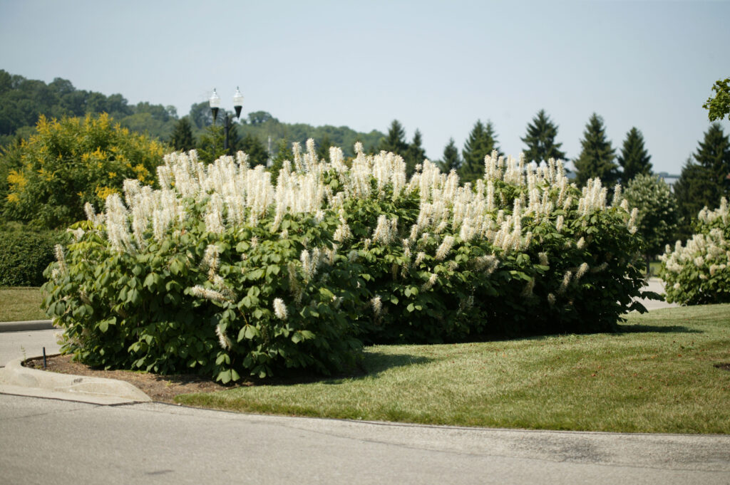 Bottlebrush Buckeye is a native deciduous shrub. Large bottlebrush-like flowers emerge in the summer. The leaves are large and palmate. The fall color is yellow.