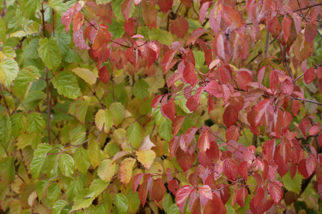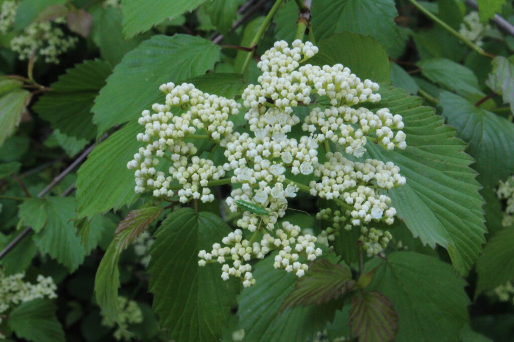 A native flowering shrub with glossy green foliage. Flowers are white flat topped clusters followed by clusters of blue fruits that are often enjoyed by birds. Dense growth habit makes this an excellent shrub for screening. Fall color is yellow.