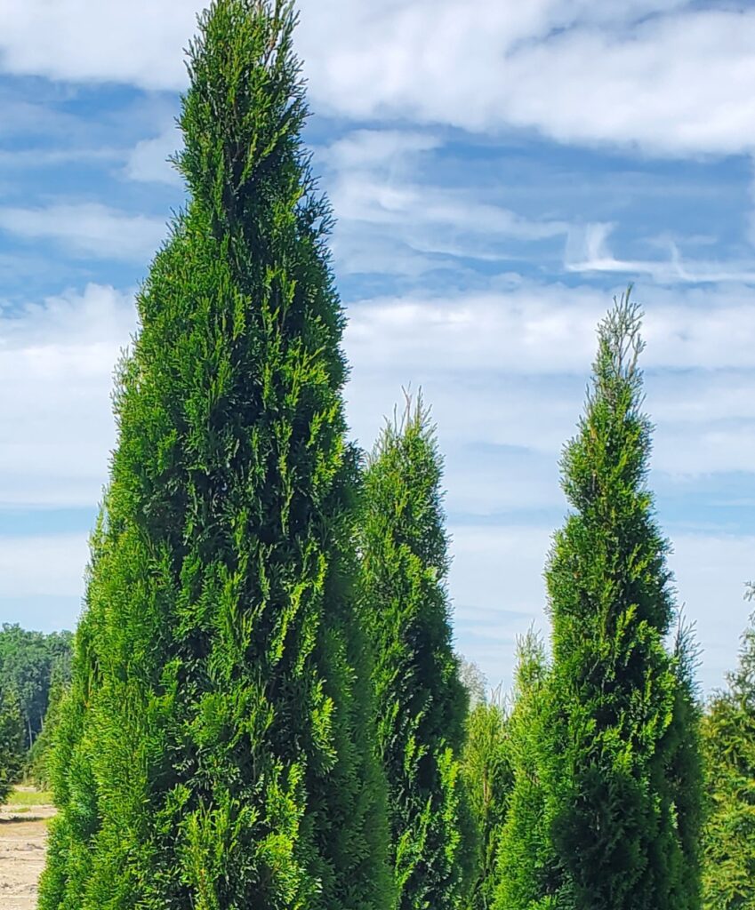 Emerald Arborvitae evergreen trees are very narrow evergreens. Foliage is emerald green and scale like. Deer browse is common.
