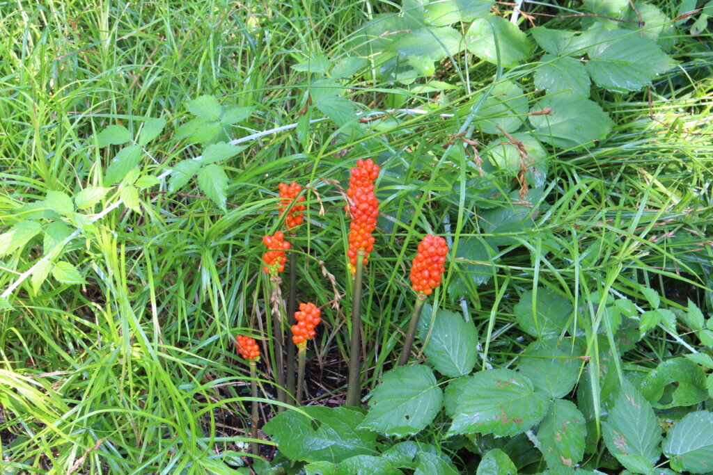 Italian Arum is a shade perennial with yellow flowers surrounded by a green sheath that is followed by extremely showy green fruits that mature to red and orange in the summer. Its attractive arrow-shaped foliage appears after the fruit in the fall, sometimes remaining evergreen.