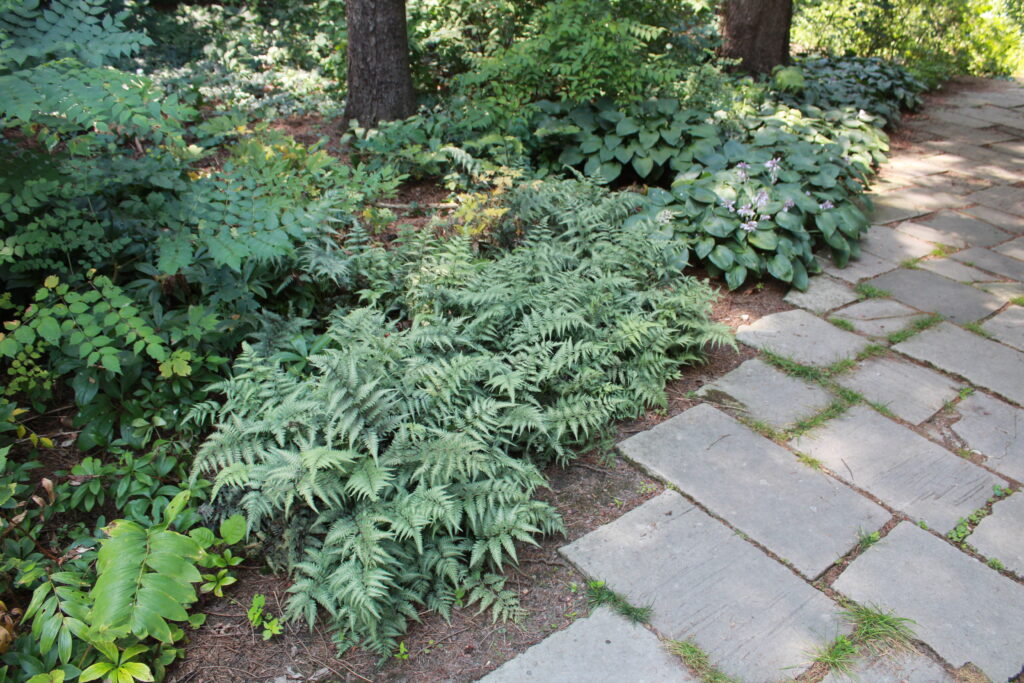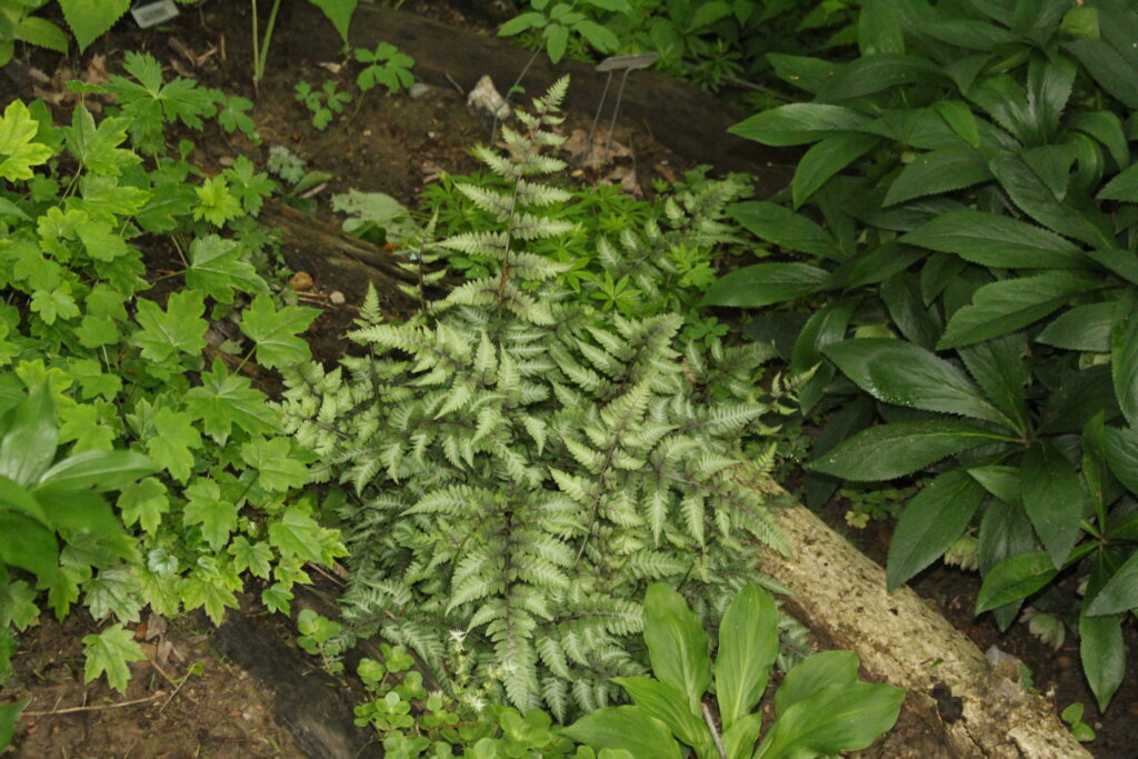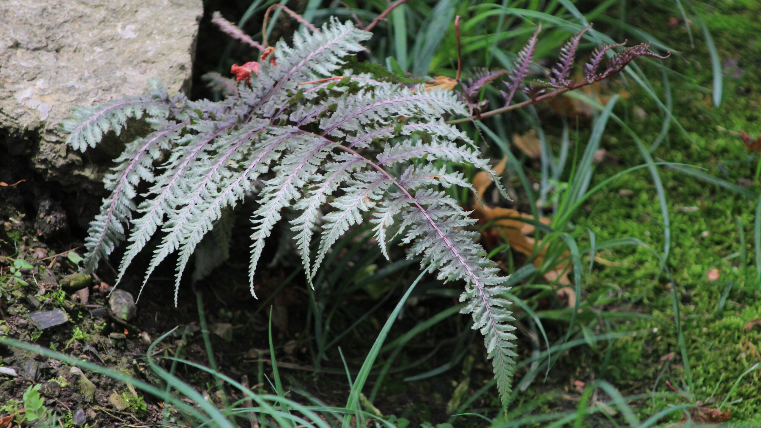 Japanese Painted Fern is a a fern with silver, blue, and purple coloration in the fronds.