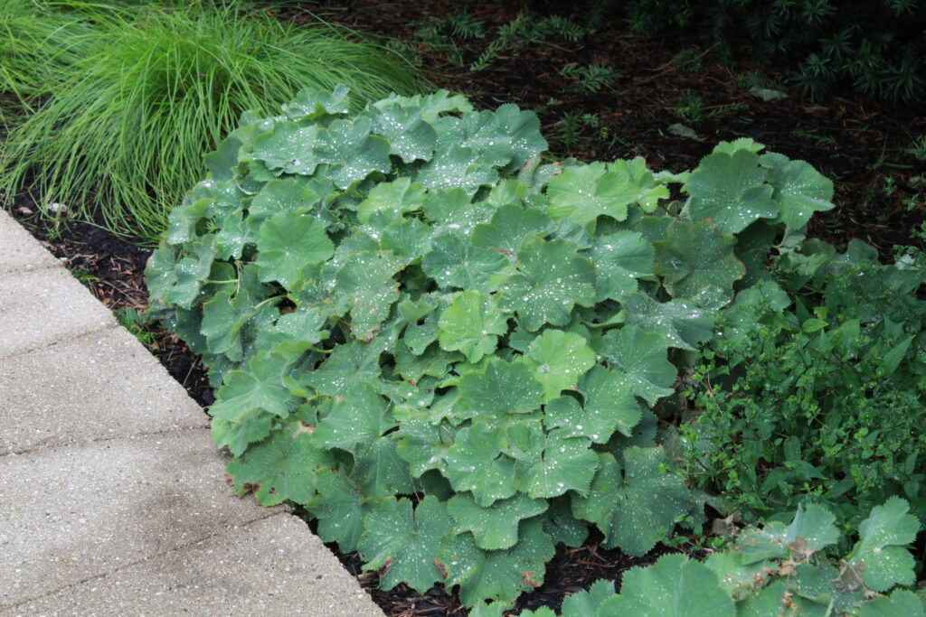 Lady’s Mantle is a perennial plant. It is a pale green plant with hairy, scalloped foliage. Water sits on the leaves in large water droplets. The flowers are yellow.