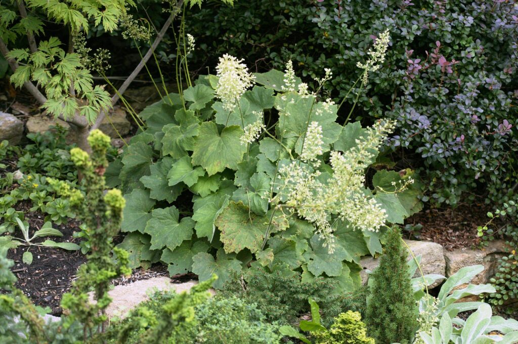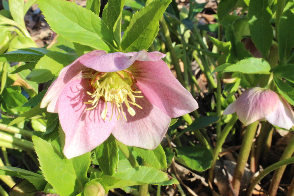 A shade perennial with tropical glossy semi-evergreen foliage. Purple pink flowers bloom in early spring low to the ground.