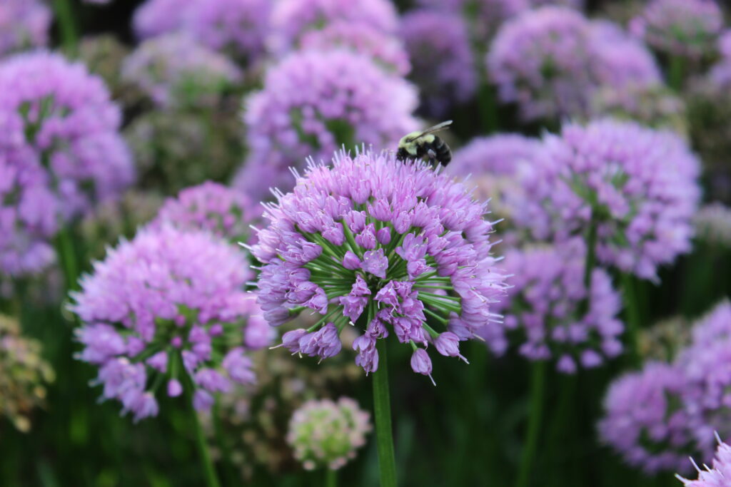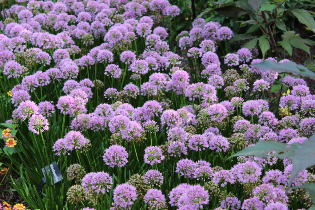 Millenium Ornamental Onion is a perennial plant. It has ball shaped purple flower clusters that bloom over grass-like leaves.