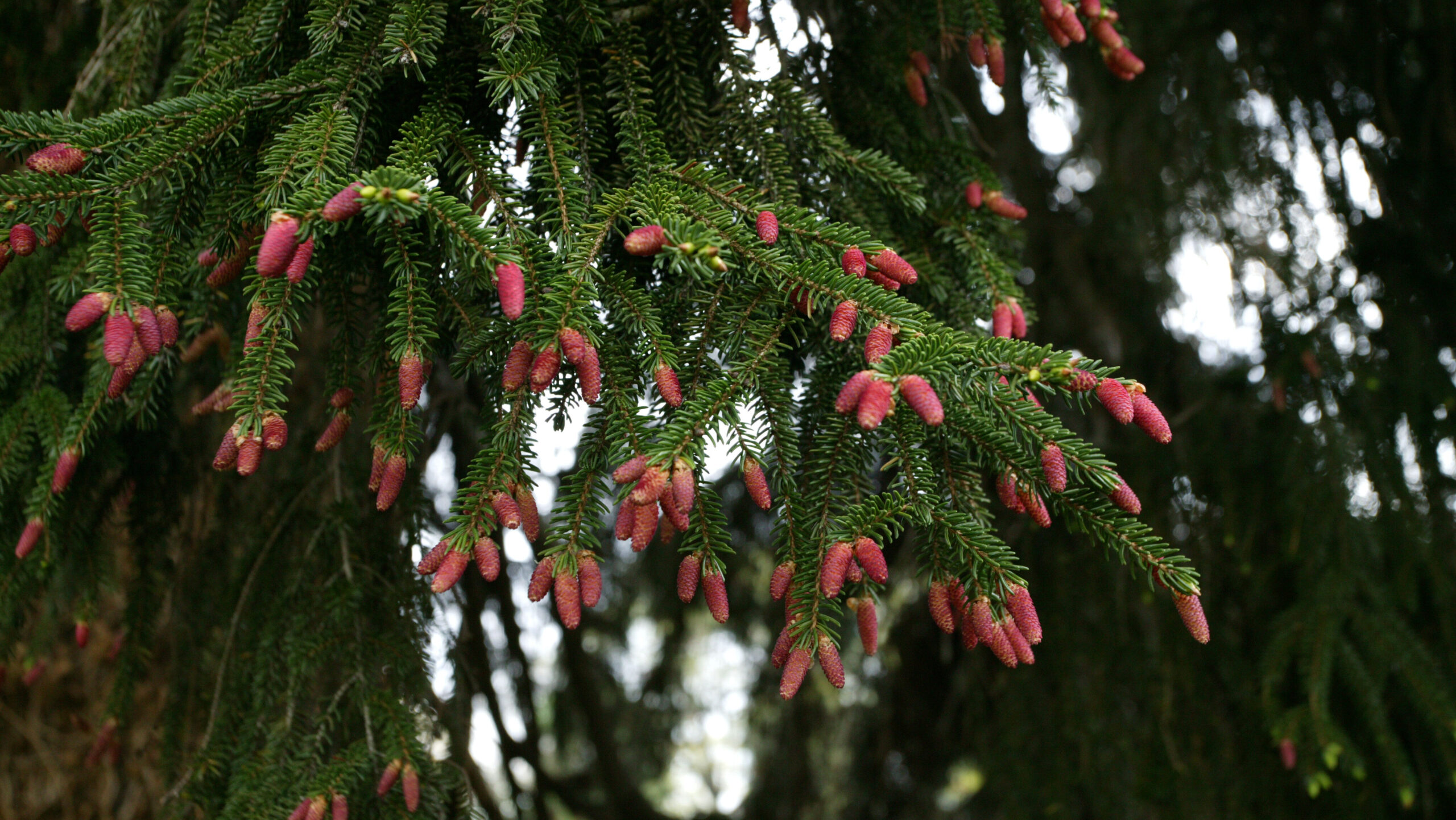 Oriental Spruce evergreen trees have needles that are short, pointy and dark green. Growth is very slow. Brown cones are pendulous.