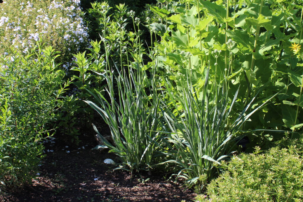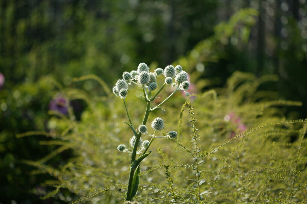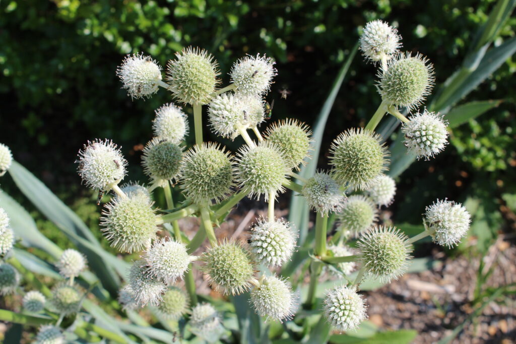 Rattlesnake Master is a native perennial plant. It is a drought-tolerant perennial with pale green, yucca-like foliage. The flowers are pale green and resemble thistles.