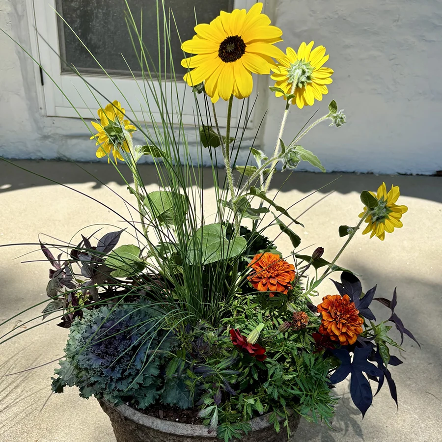 We will design a beautiful, carefully curated seasonal mixed planter that customers can drop directly into their own decorative pot.