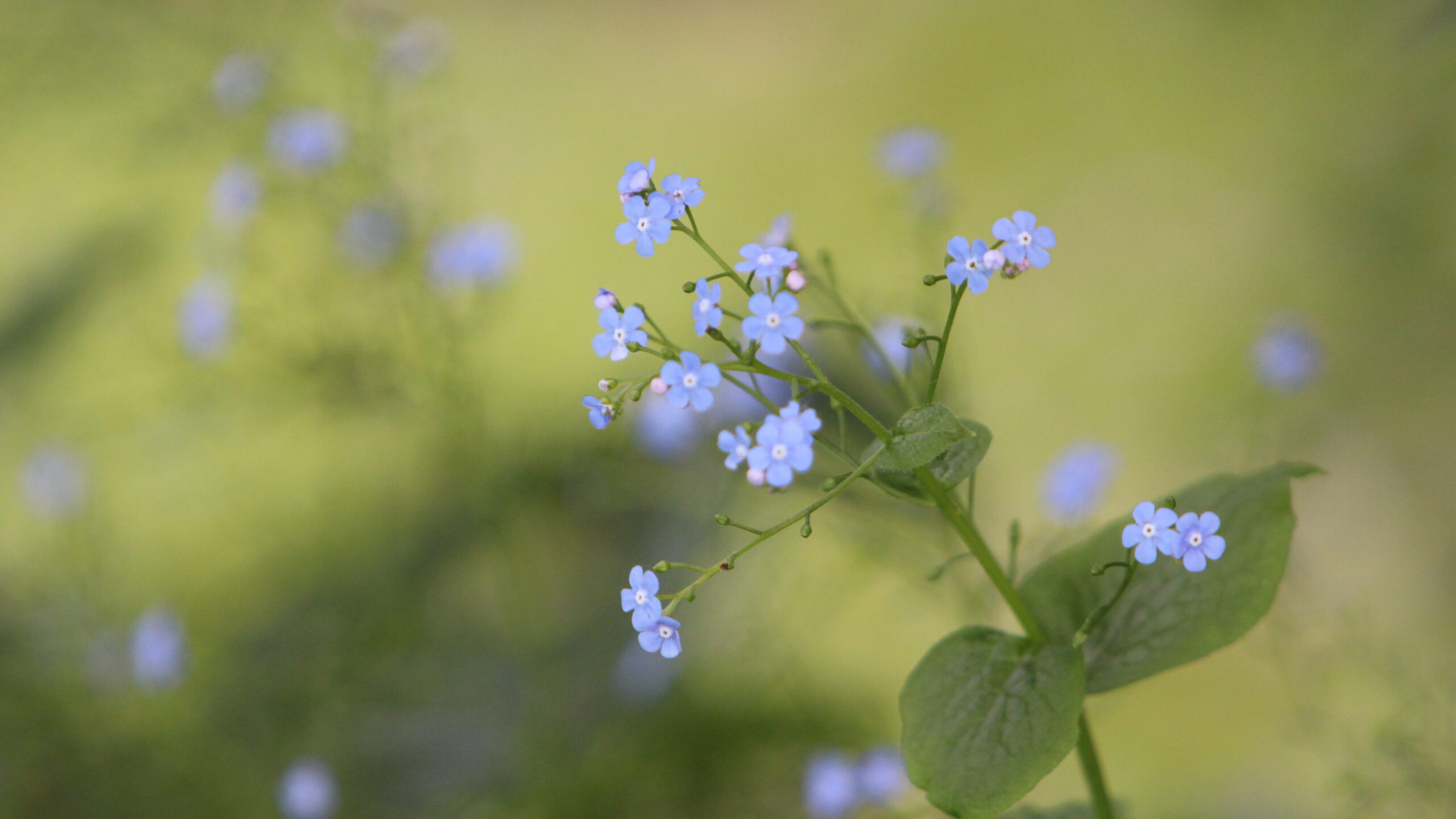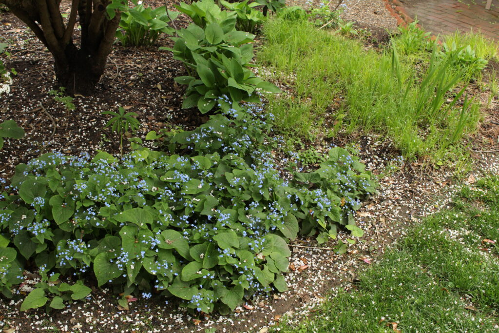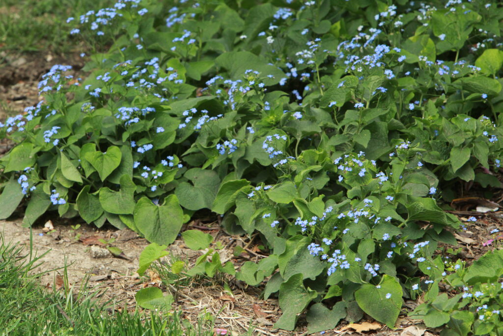 Siberian Bugloss is a shade perennial with green, heart-shaped leaves. The flowers are very small, blue clusters that bloom in the spring.