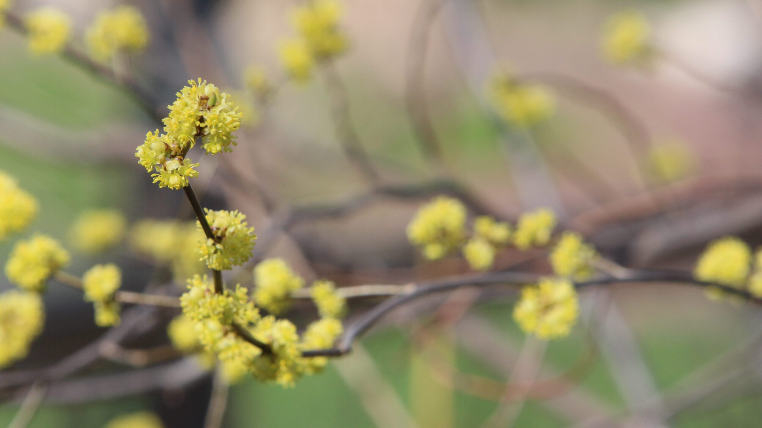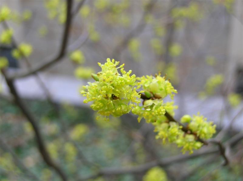 Native. Flowers on the male plant are larger than those on the female plant. Flowers are very small and yellow, blooming in the early spring. Red fruit is covered by foliage until the leaves turn yellow in the fall and fall off. Leaves are fragrant when crushed.