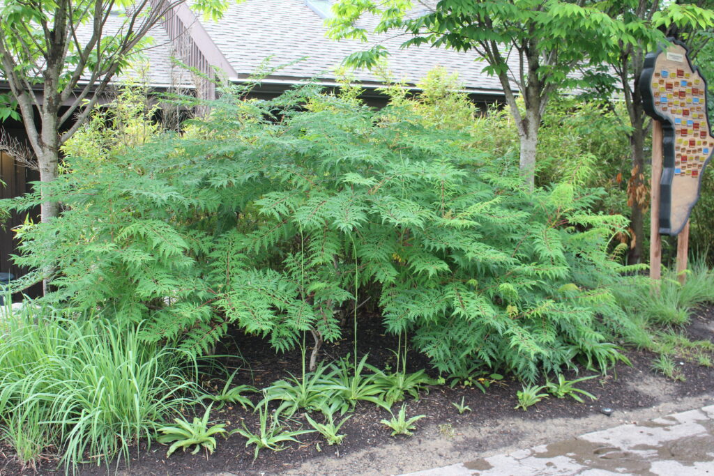 Staghorn sumac is a native deciduous shrub, native to North America. It is a very open, tropical looking shrub. The flowers are green spikes that turn into bright orange-red fruit that attracts wildlife. Fall color is a bright orange-red.