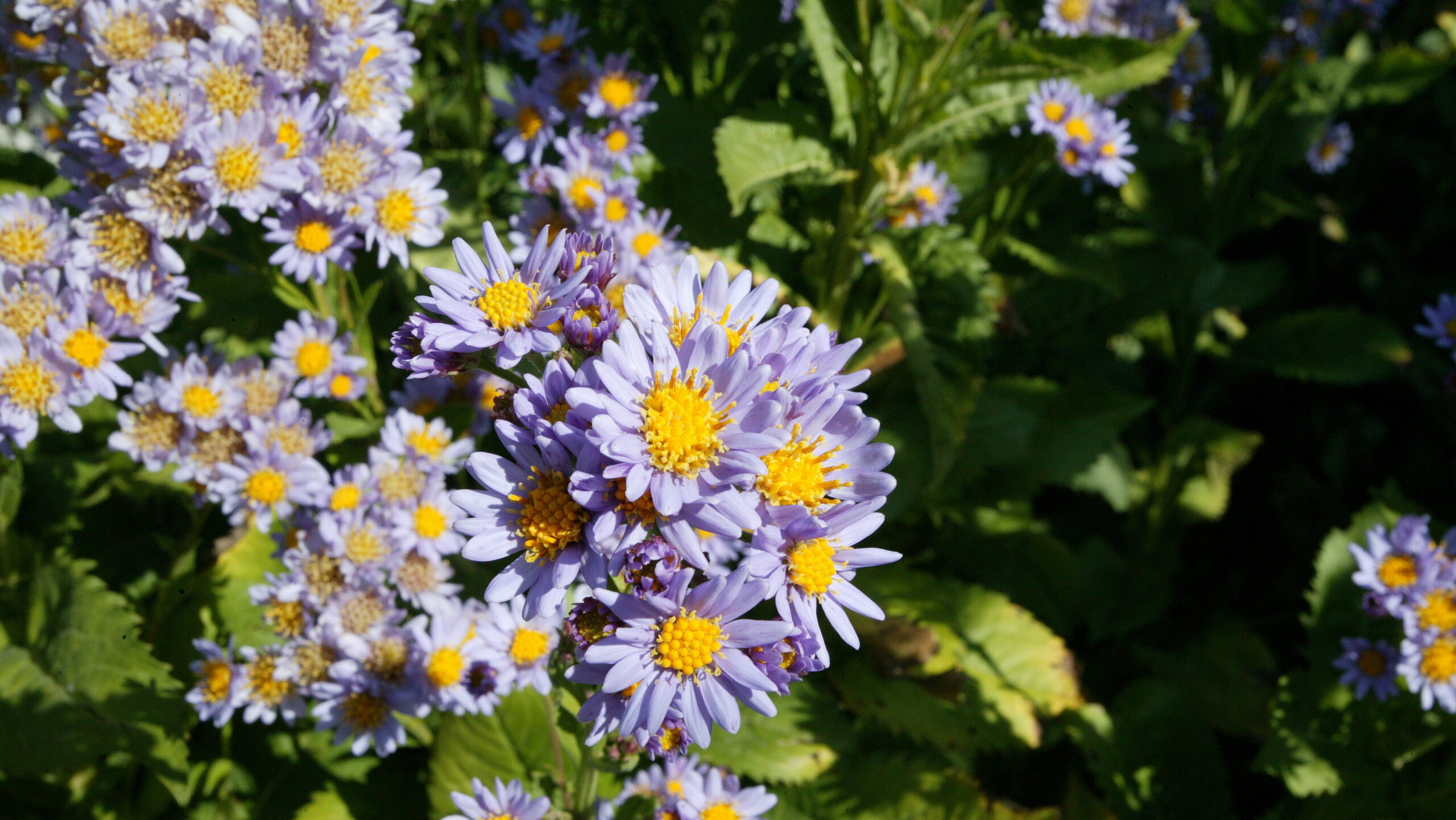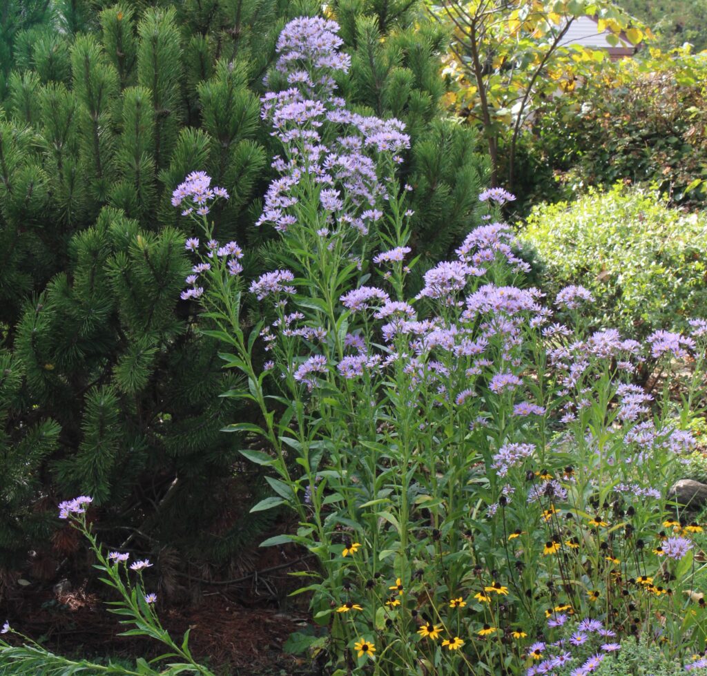 A tall plant with light purple flowers and yellow centers that bloom in the fall. Attracts butterflies.