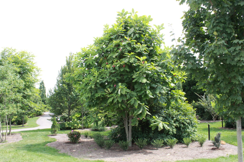 Umbrella Magnolia is a native shade tree. It is a small Magnolia with large, ovate leaves. Flowers are white and bloom in spring.