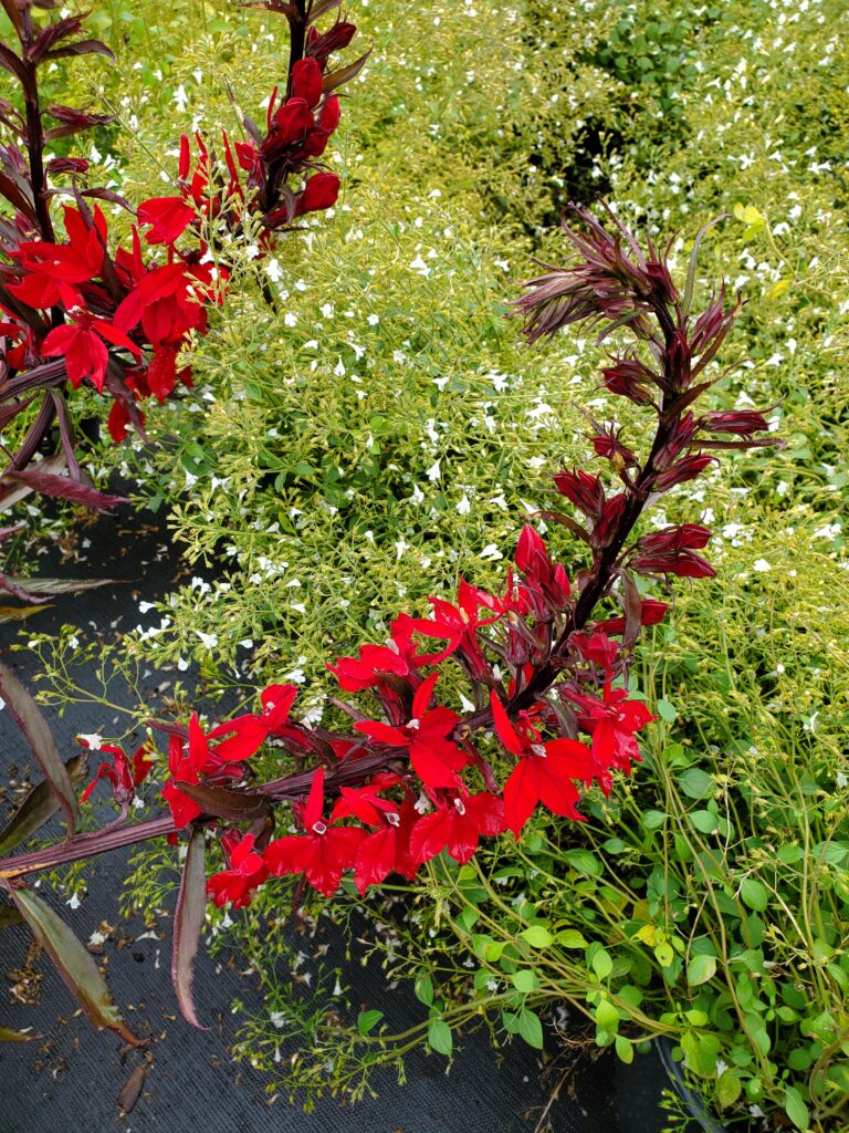 Vulcan Red Cardinal Flower is a native perennial plant, native to North America. It has showy red tubular flowers that bloom on dark purple-green stalks in the summer. It attracts hummingbirds and butterflies.
